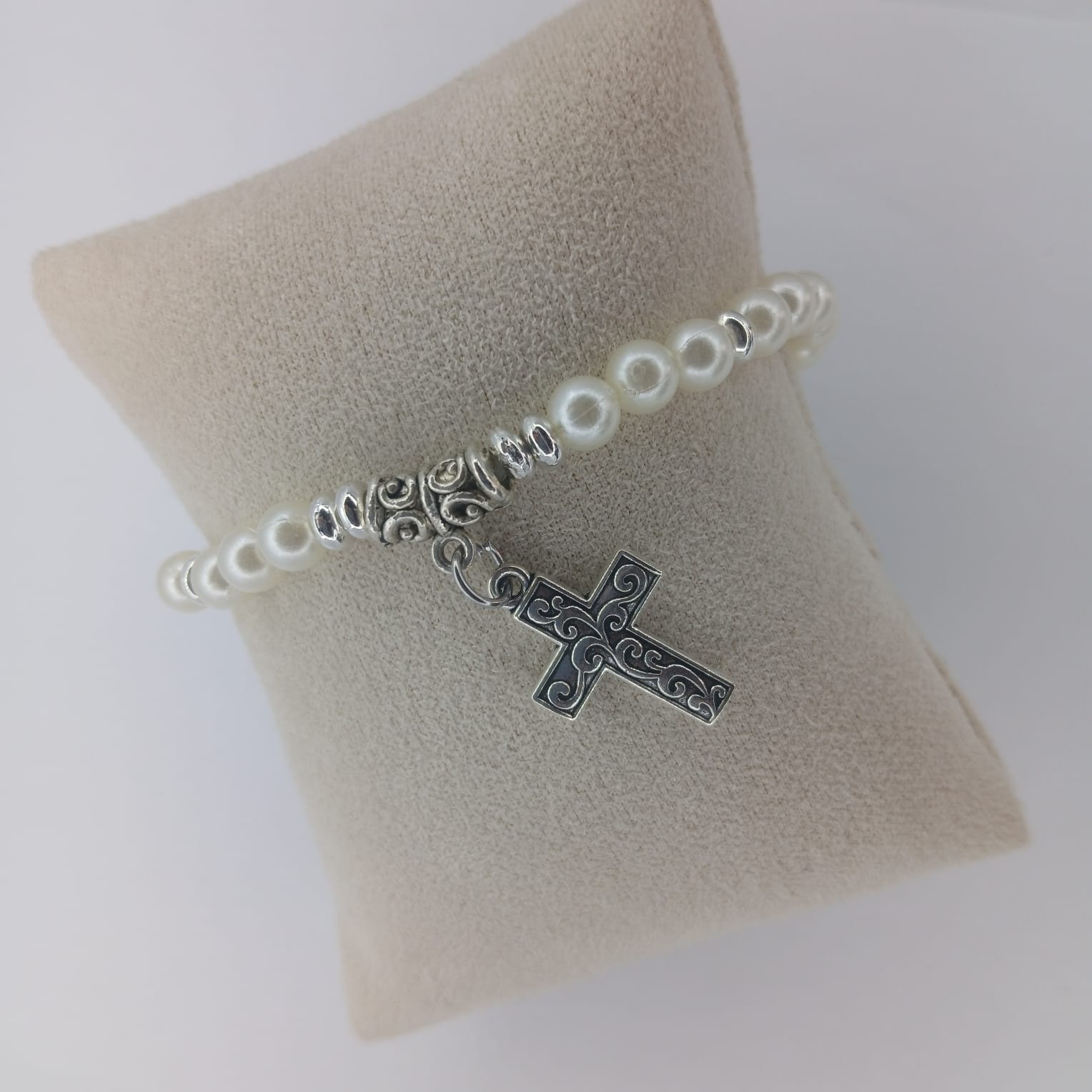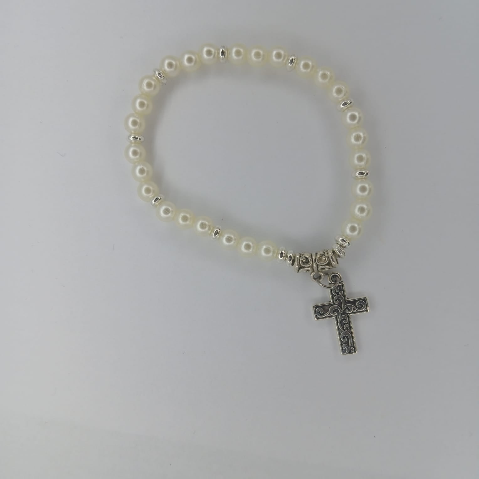 Pearlies with silver spacers and a silver cross. The name of the bracelet speaks for itself. Spacers are silver and the cross is silver plated.