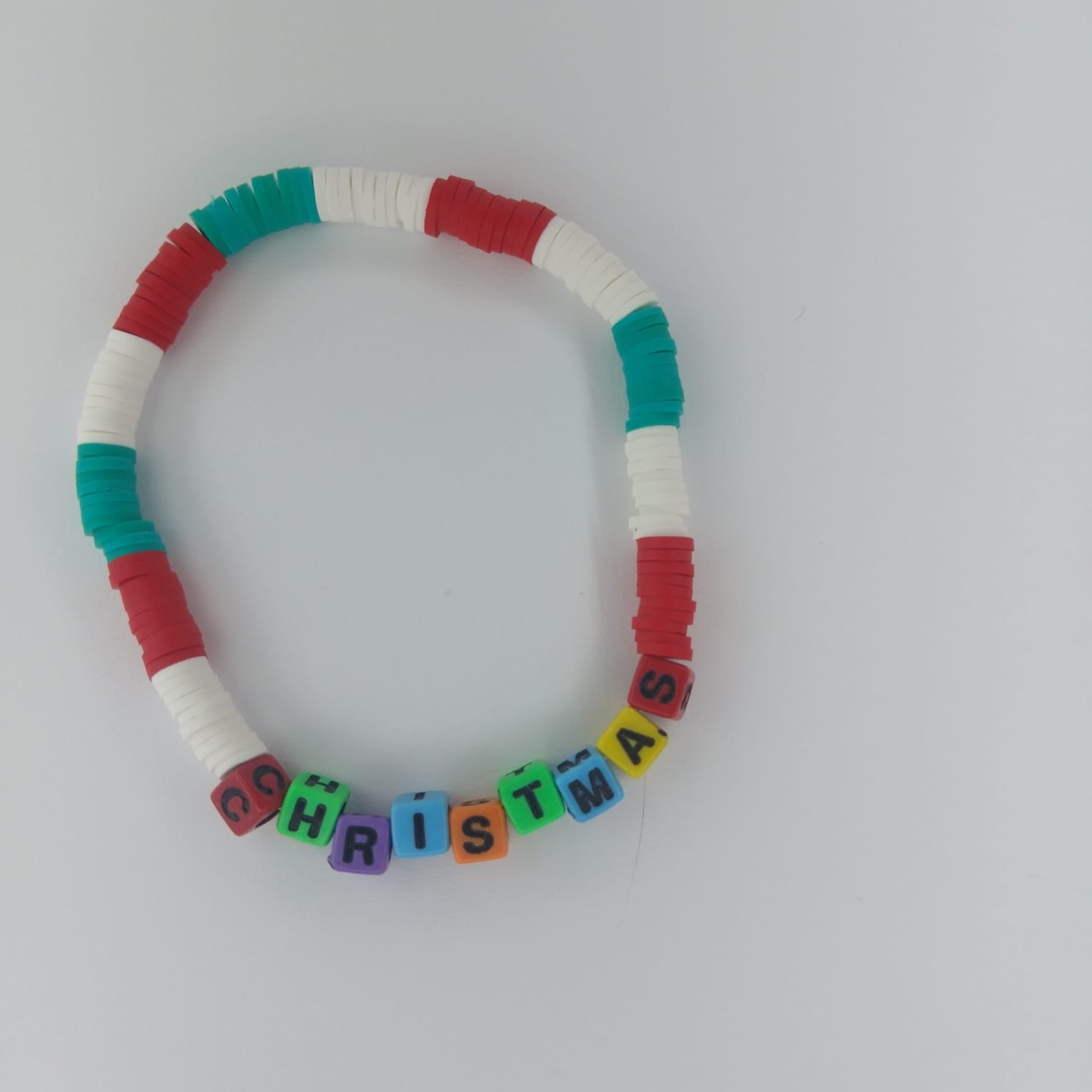Christmas coloured polymer clay beads with a colourful "Christmas" message.