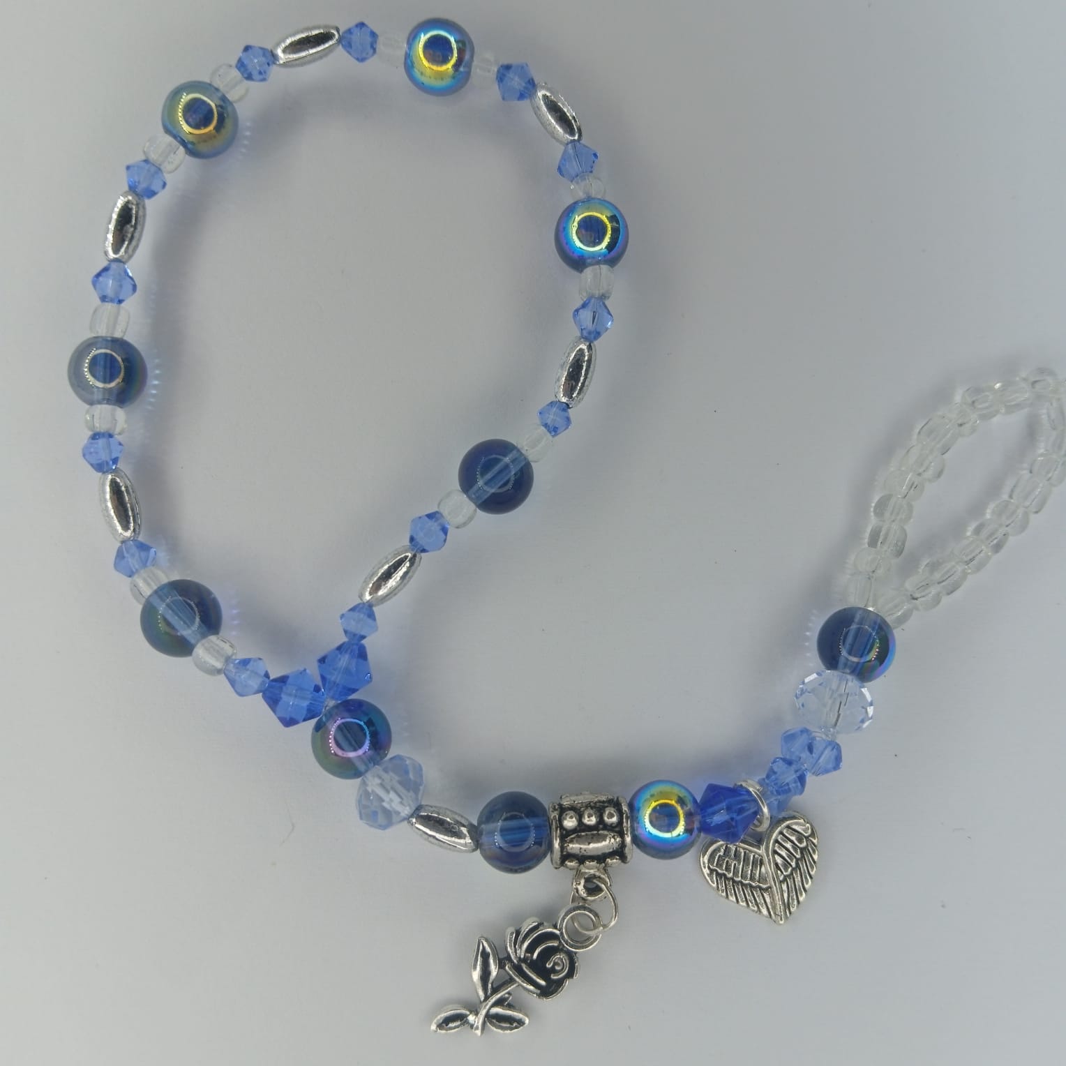 Stunning ring bracelet boasting hues of blue and two silver charms. This is Hand Candi that shows inner strength and confidence. The rose and wing charms fit the glass, seed and crystal beads perfectly. A beautiful combination.