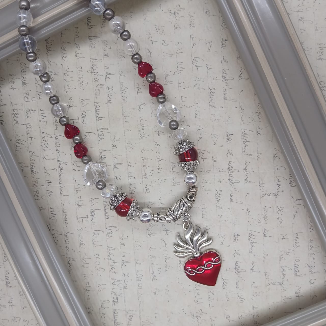 Stunning Piece. Silver, red flaming heart surrounded by silver spacers, red glass and crystal.