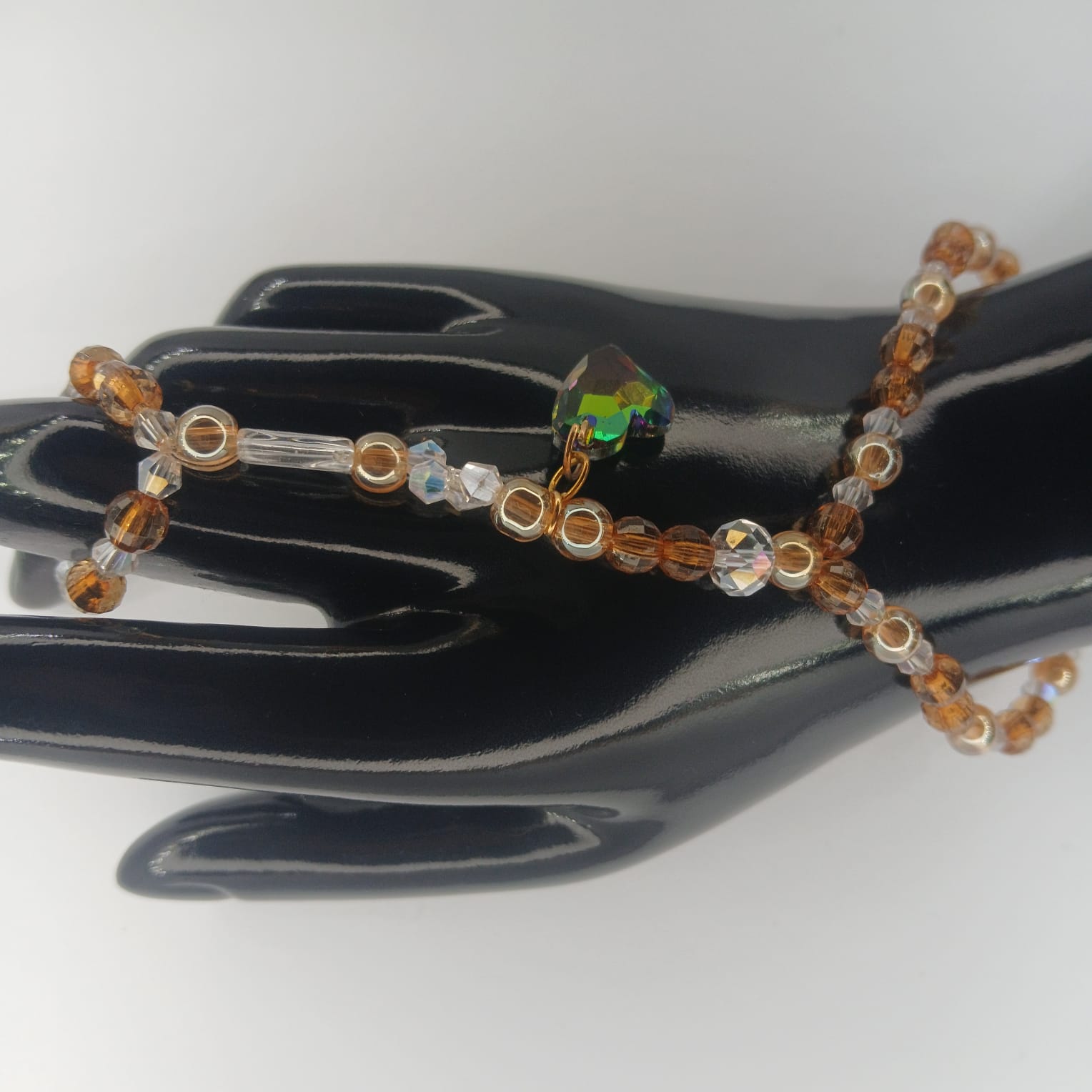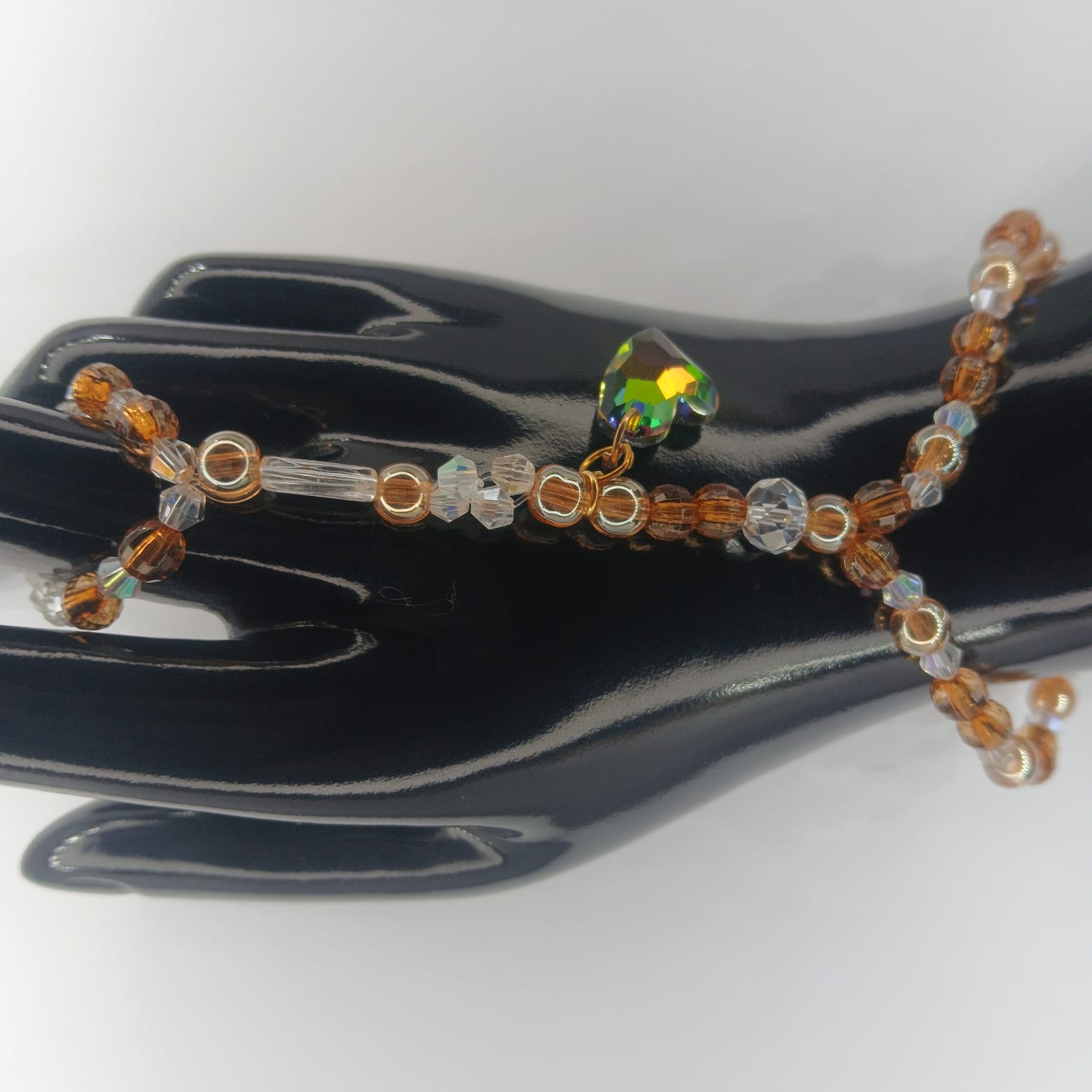 This attractive Hand Candi consists of a ring bracelet with Glass, crystal and acrylic beads and boasts a stunning faceted heart charm. Beautiful Goldish colours.