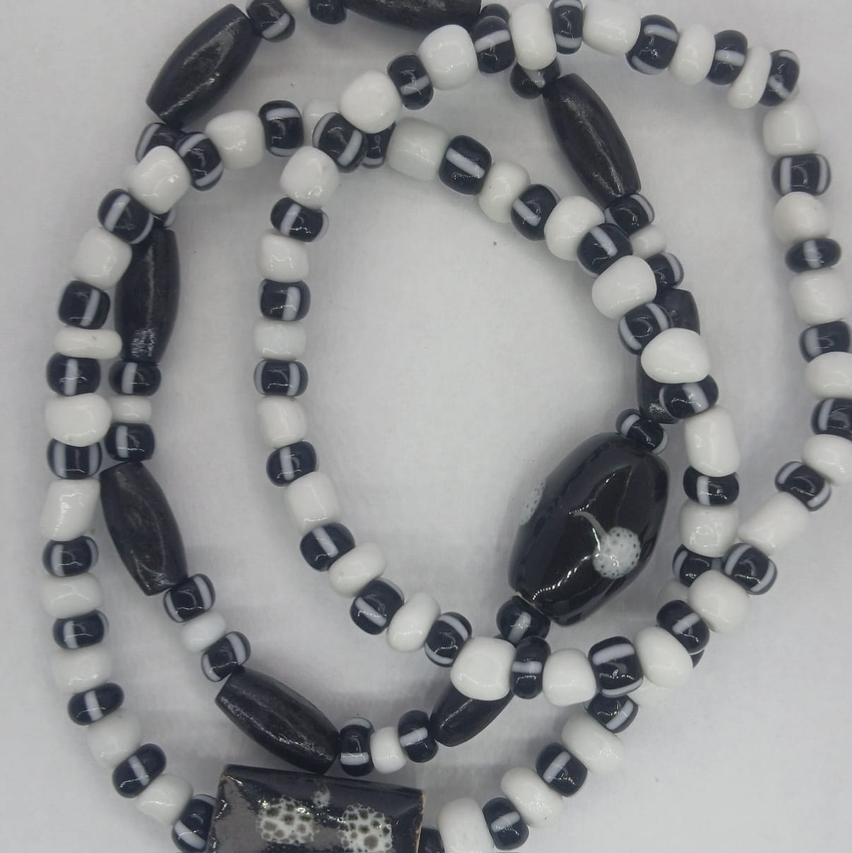 A stunning and eye-catching set of 3 bracelets in black and white seed beads, ceramic features and wooden accent beads. Bold and speaks volumes.