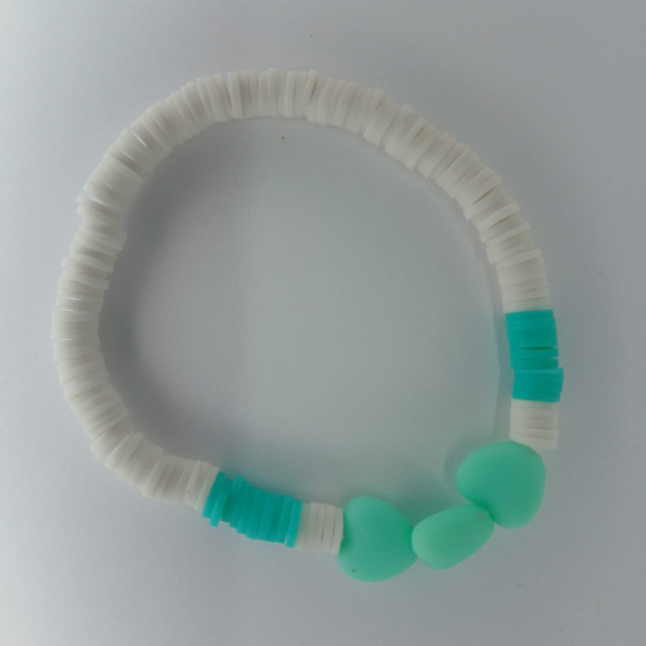 White polymer clay beads surround mint green hearts. Lovely and easy to add to another set or pair of bracelets.