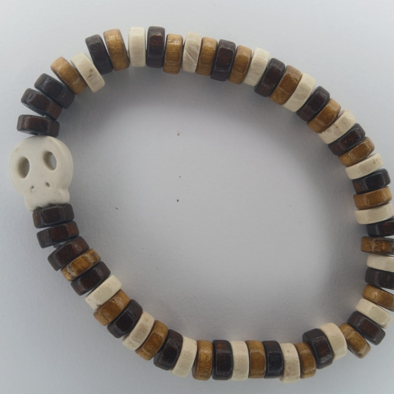 Wooden beads leading to an acrylic skull charm. For the individual that likes being "individual".