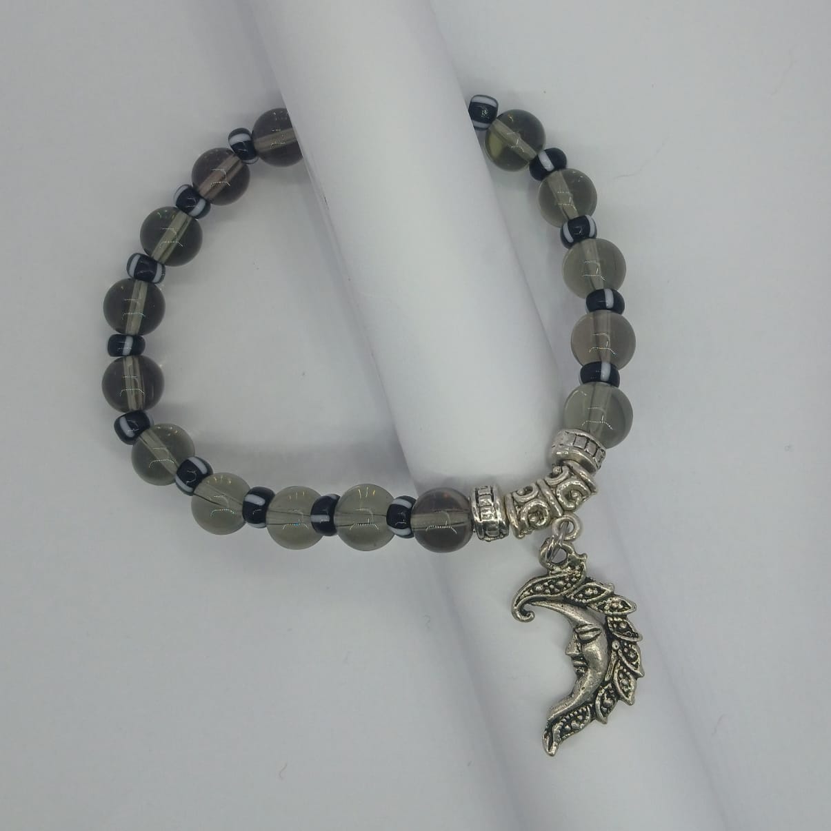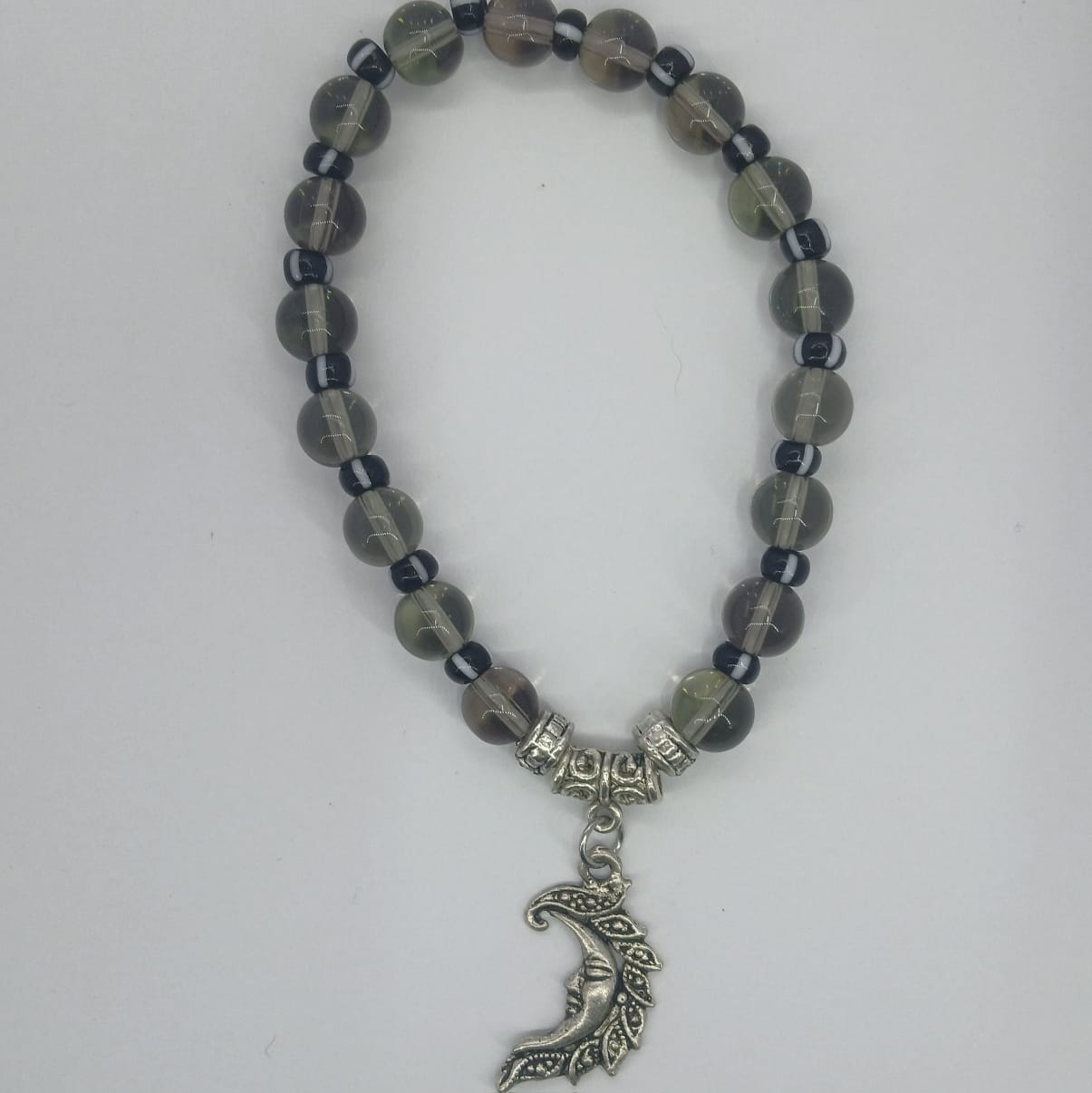 This bracelet has a mystical feel to it. Almost translucent glass beads with small black and white seed beads and a beautiful "man in the moon" silver charm. It's solid and feels beautiful on the wrist.