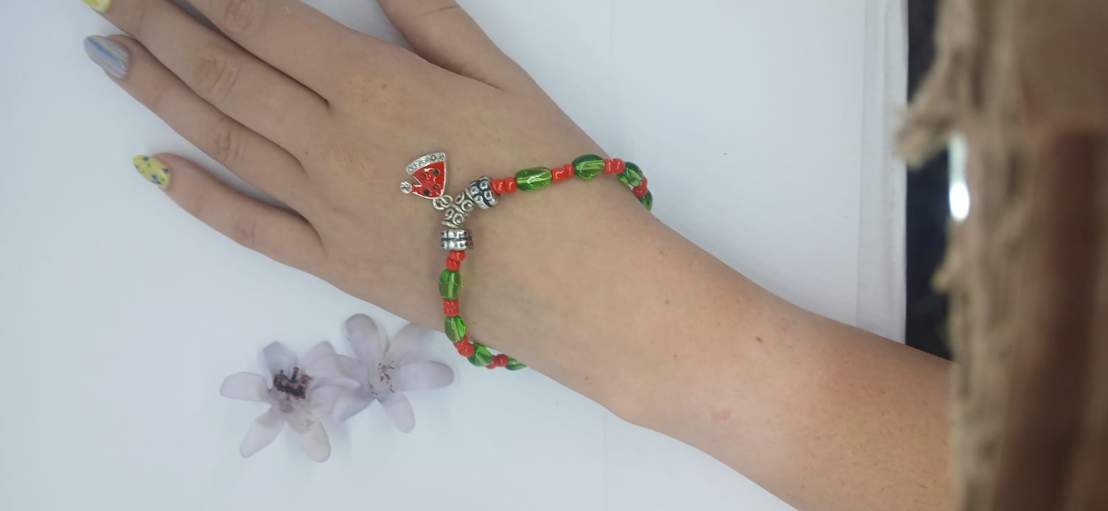 Christmas Red Hat Charm and green glass and red seed bead bracelet
