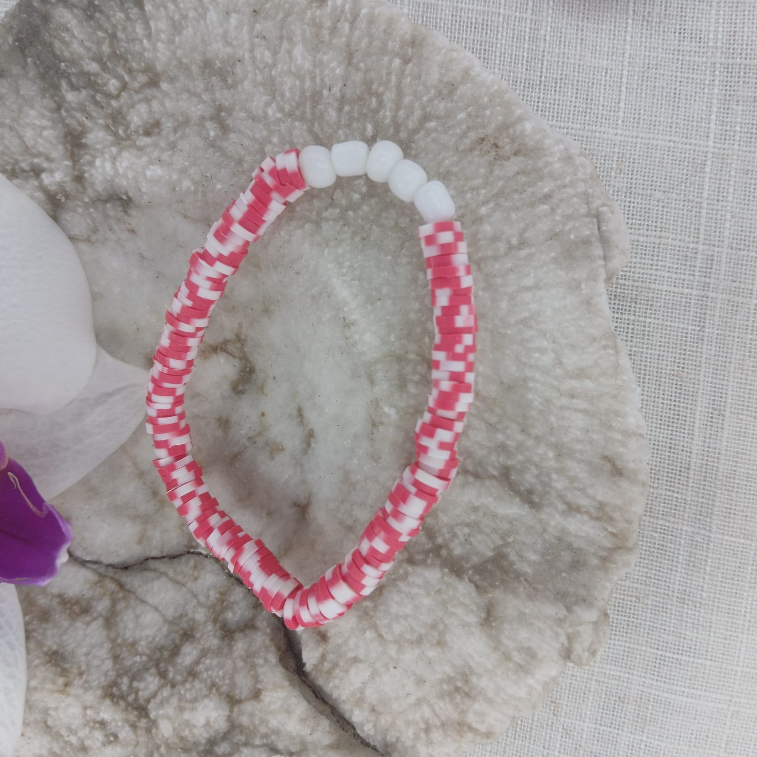 Vibrant white and red in this wrist stack, a wood with red glass trim bracelet, a polymer red and white seed bead bracelet and a red seed bead bracelet to complete the look.