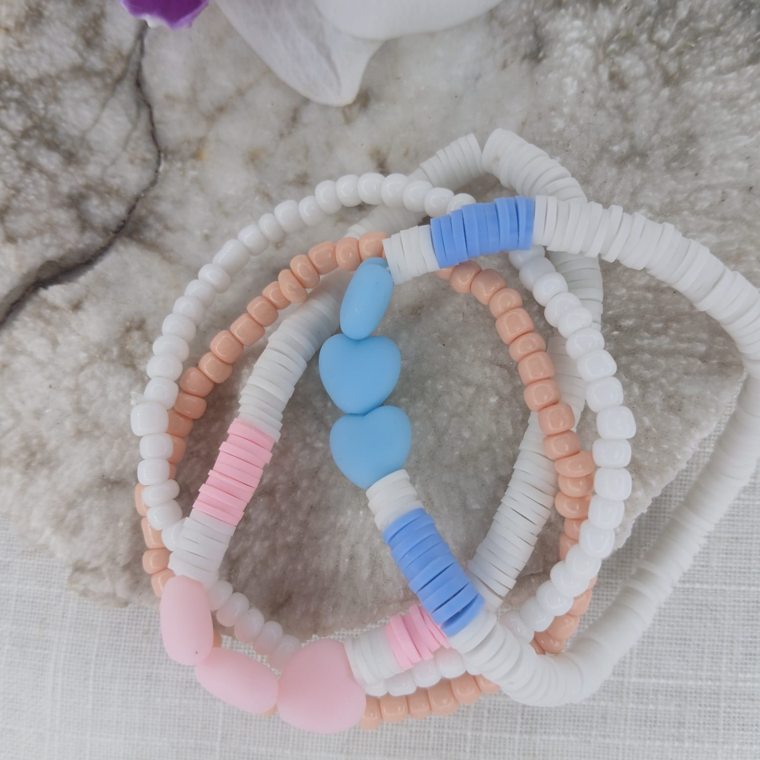 Beautiful feminine colours - a wrist stack that includes 2 seed bead bracelets in tan and white, with one blue acrylic heart and polymer bracelet and a pink acrylic heart and polymer bracelet to complete the look. Stunning feels.