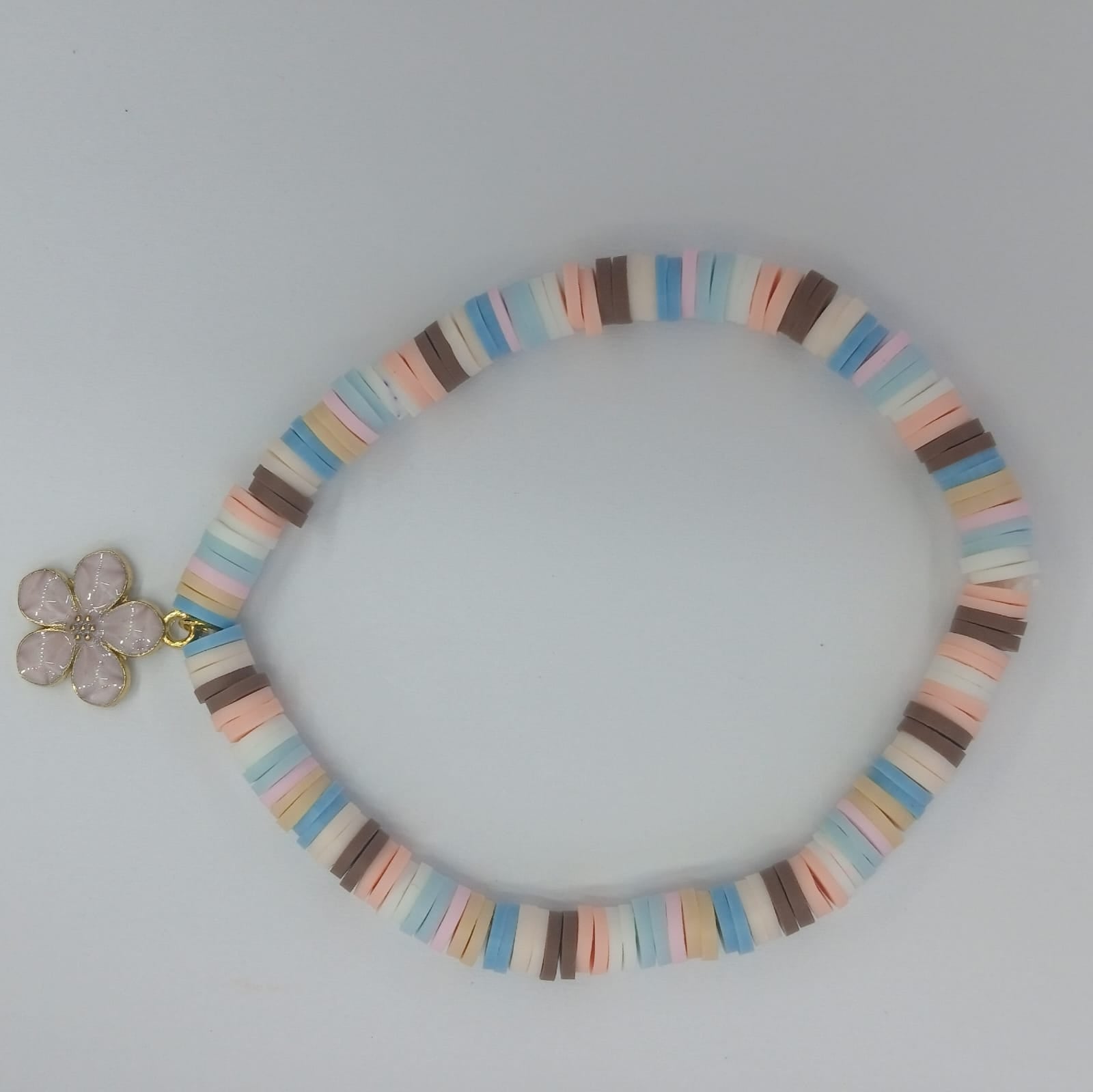 Blush pink flower with blue, blush, aqua, brown and white polymer clay beads. Stunning.