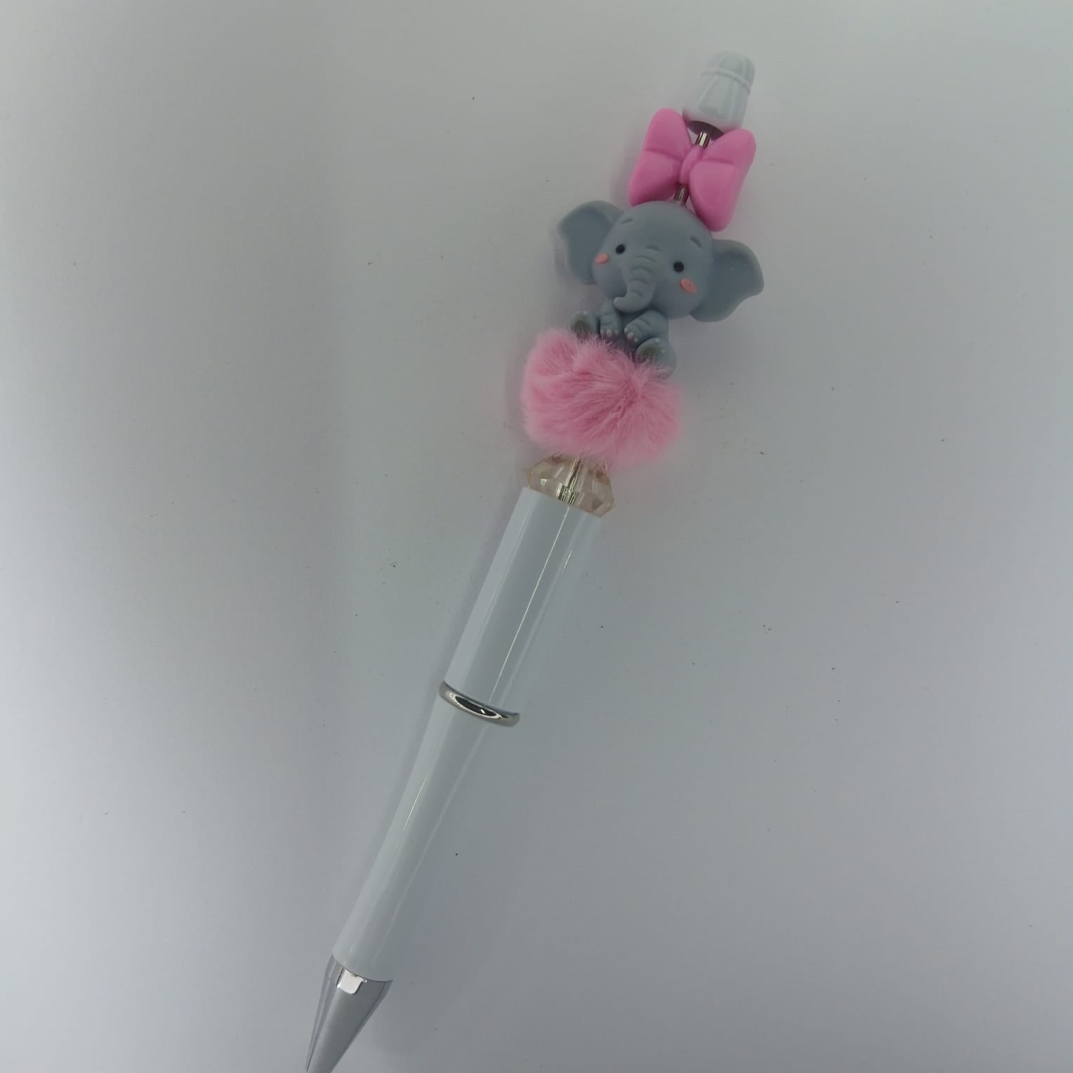 The cutest white pen with pink and grey touches. Sally, the elephant is surrounded by pink fluff and a cute bow. The perfect gift for Christmas.