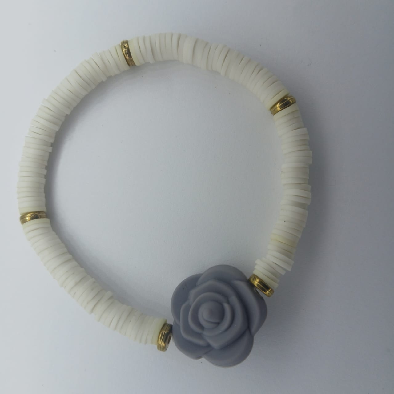 Lovely white polymer clay beads surrounding a grey rose and small goldish discs in-between. A clean look. Lovely to wear.