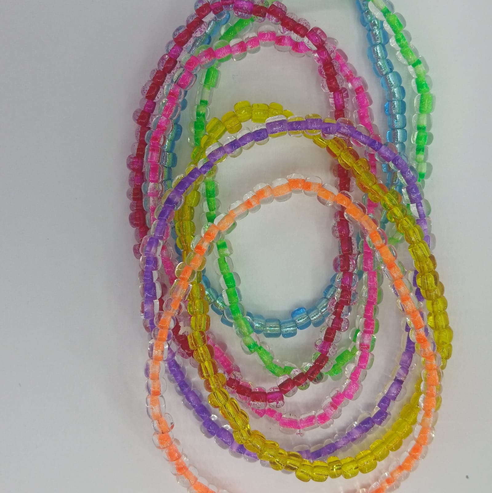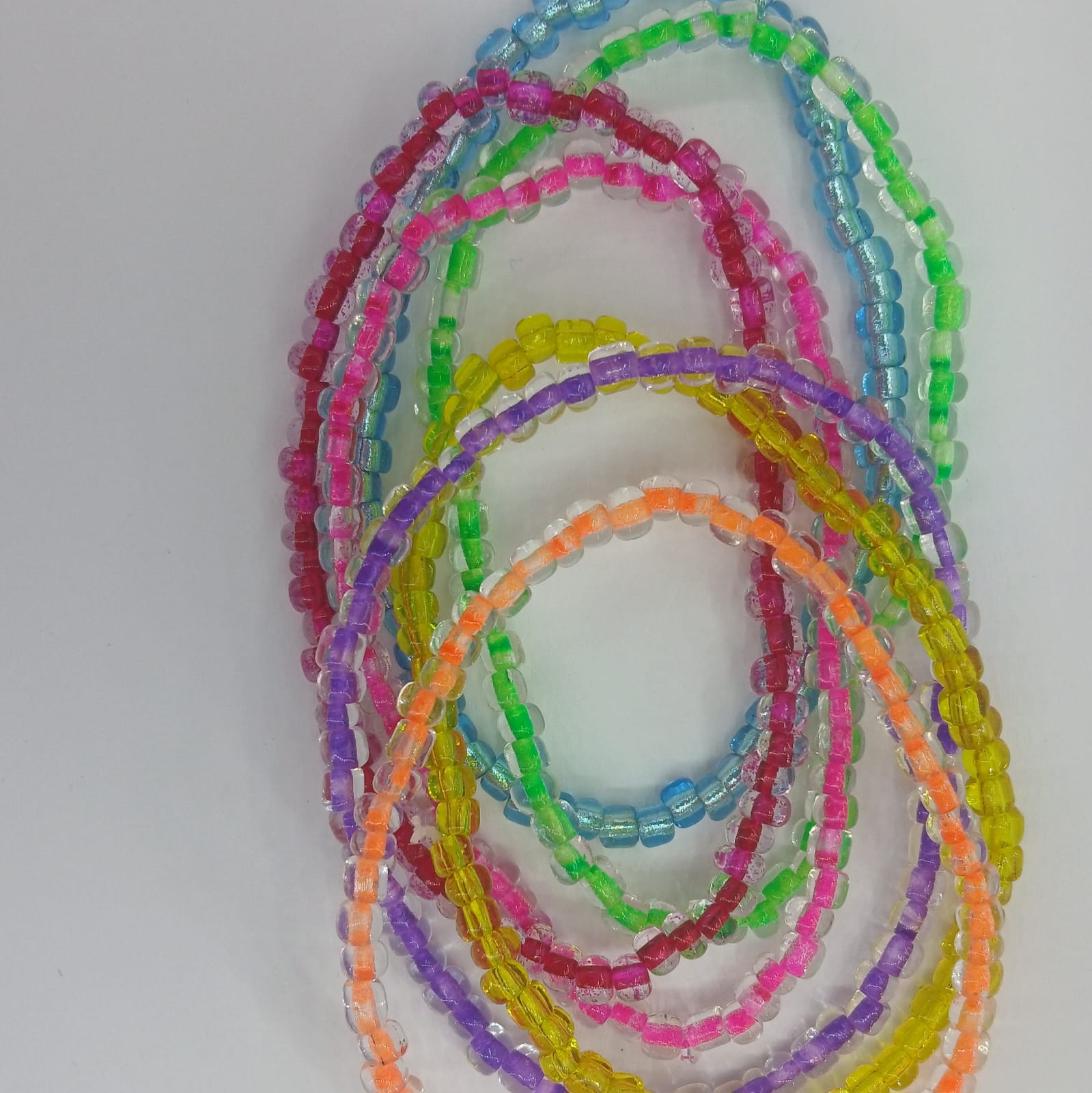 7 Colourful Glass bead strand - striking blue, orange, green, pink, yellow, rouge, purple make up this combination of stretchy pack. Stunning no matter what.