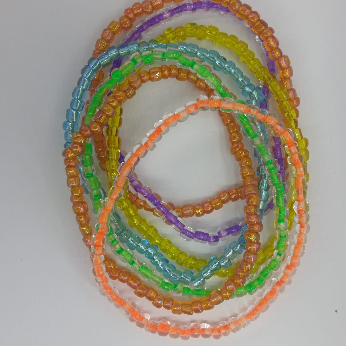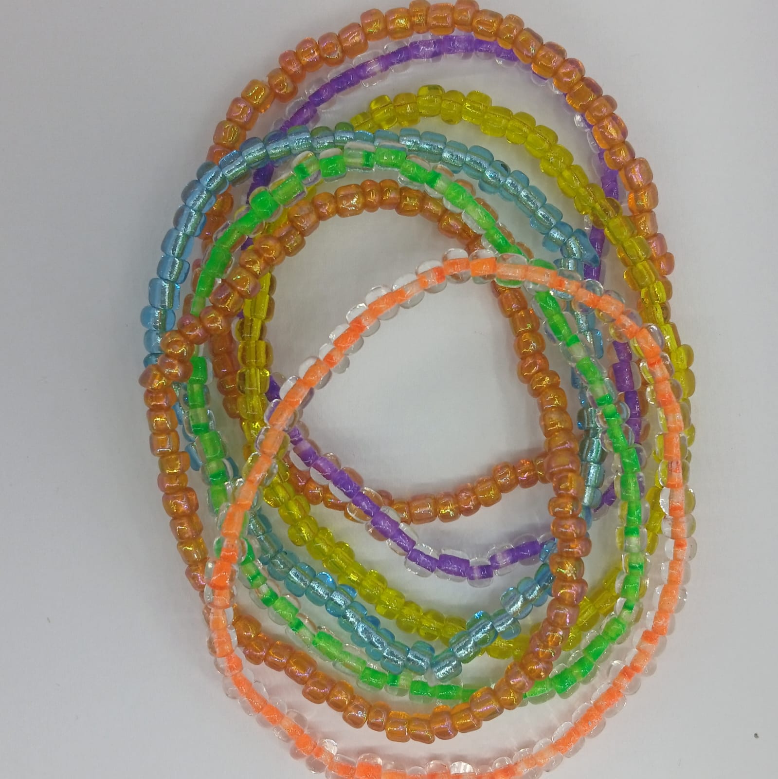 Stunning vibrant colours create a big impact on the wrist. Orange, purple, ice blue, green, yellow, and smokey orange stretchy bracelet. 7 pack bracelet set.