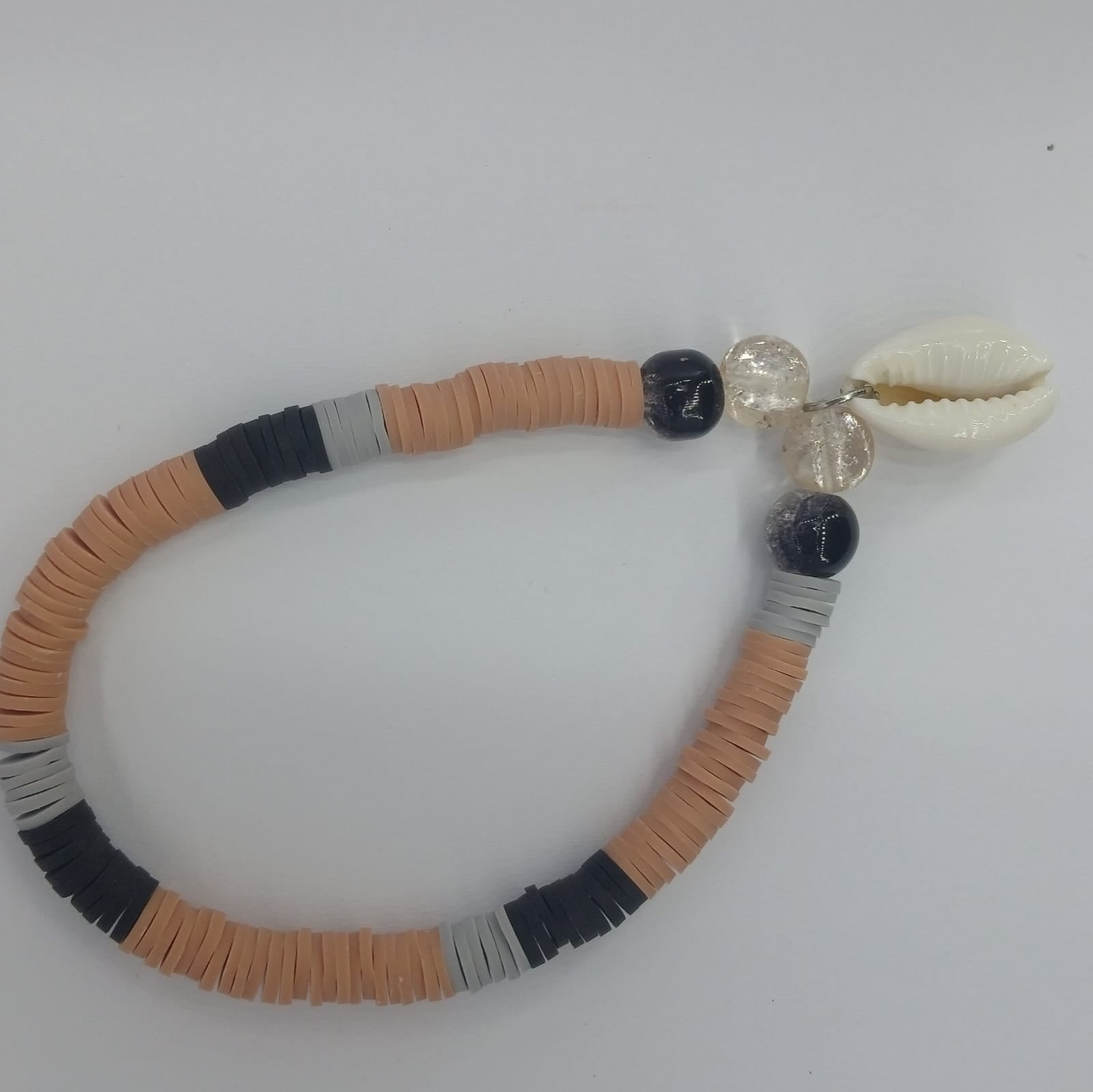 Good feels polymer clay bracelet, tan, black and gray with 4 crackle beads and a shell charm. So now.